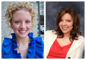 Model on the left: Her necklace mimics her curls and haircolor, and the blue blouse matches her eye color.